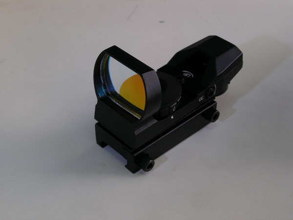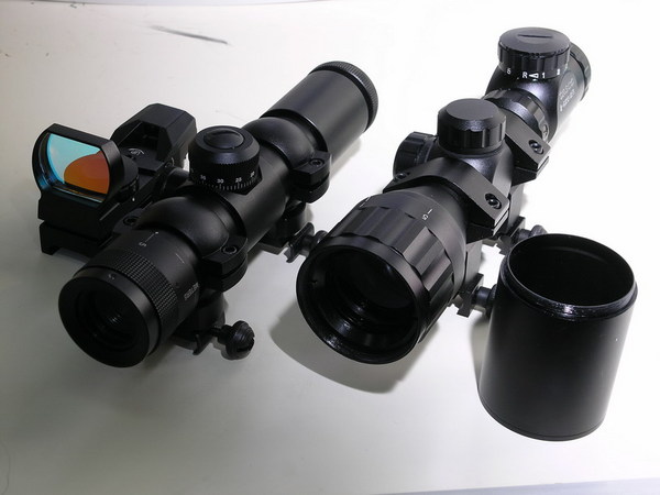 從左到右: 四圖樣內紅點, 4x21mm 30mm 管徑, 2-6x32mm 25mm 管徑短版, 及其專用延伸遮光筒