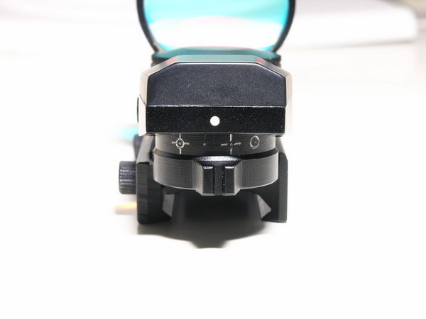 當然也照前面兩根瞄鏡的慣例, 我挑了一個圖案起來做測距, 這部份就請自行參考了. 內紅點最神奇的地方就是不用去管偏軸的問題, 因為它是用凹面鏡的全反射來形成一個無限遠處的虛像, 因此不論你從那個角度看過去(只要還看得到紅點的話), 原則上瞄準點是瞄在同一個(無限遠)地方的. 再加上高亮度的視覺吸引效果, 也使得他遠較前兩支瞄準鏡還來得適合近戰(啊不就是剛好 BB 槍的有效射程嗎?). 當然, 偏軸偏太多還是會有點點誤差啦, 且圖樣也會變形. 適當的調整同時是必要的. 另外, 不知道是整批貨的問題還是原本就設計不好, 圖樣有向左邊旋轉~3 度的樣子.