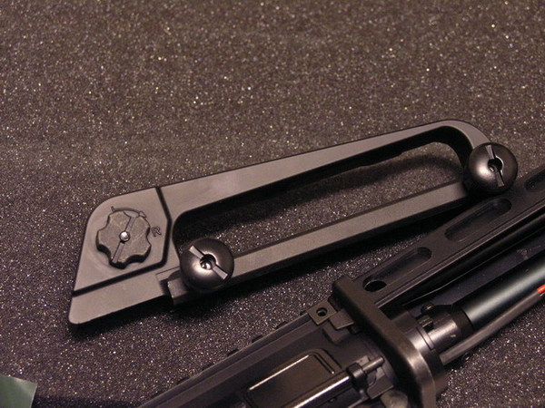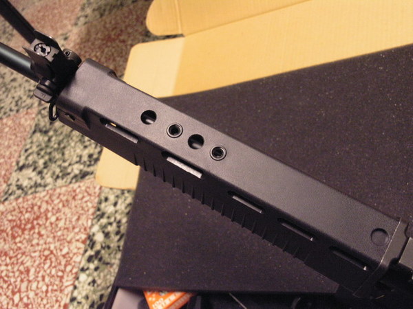^^^^ 上護木軌道及其他附件固定座. 有螺紋, 難道就是之前 T91 剛出時被罵的半死的上護木軌道座固定方式嘛? 這問題我想應該不會很嚴重..畢竟真槍上面重要瞄具還是會放在上槍身軌道上, 會放在這邊的應該是比較不重要的附件. 諸如榴彈照門等等. 不過我也覺得這部份如果有金屬片連結準星座和護木座的話, 應該會更加穩固.
