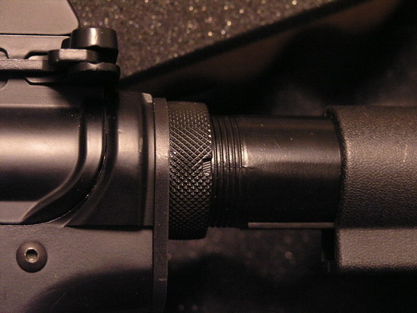 其實一些招牌都有做出來, 除了前面的打印之外, 諸如特殊的四孔外加 12 小孔的防火帽設計, 一體準星座, 護木, 後托, 提把, 上槍身, 握把等等, 外觀上至少都有做出來, 至於與真品比較如何? 不幸我沒摸過真槍因此沒得比較..=.= 火帽沒有一般 Marui 的定位內六角螺絲, 而是如真槍般用顆螺帽幫助鎖定. 一體成形準星座與槍管的固定方式是採用下方的兩顆小螺絲幫助固定, 如果有鎖緊倒是不太會晃. 手頭上的仿 M9 刺刀可直上, 模型刀則需要小修一下. 裝飾瓦斯鋼管是可拆卸的, 但實際功能不大, 有雜誌號稱可以幫助固定準星座, 在我看來倒沒這回事, 因為上槍身的洞太大, 且這根裝飾管太有彈性了.