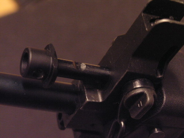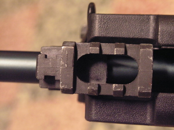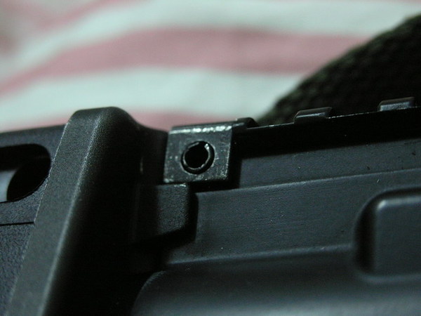 ^^^^ 準星座近照, 注意下面的固定用螺絲. 準星後面的那個貫穿凹洞..是做什麼的呢? 有人知道嗎? 在刺刀座中央也同樣有個穿透圓孔..另外也可注意一下護木的紋路