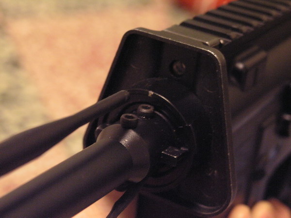 ^^^^ 裝飾槍機連動桿(這樣叫嗎?)則是要將上面的 "F" 鈕旋轉 90 度後方可拆卸. 桿上面有個凹洞, 要注意凹洞朝上才可再裝回去. 上槍身的洞其實還比此裝飾桿後端還大個 0.7mm ~1.2mm 左右. 同時注意槍管固定座固定方式, 似乎是與 Marui 舊 M4 系是同樣的