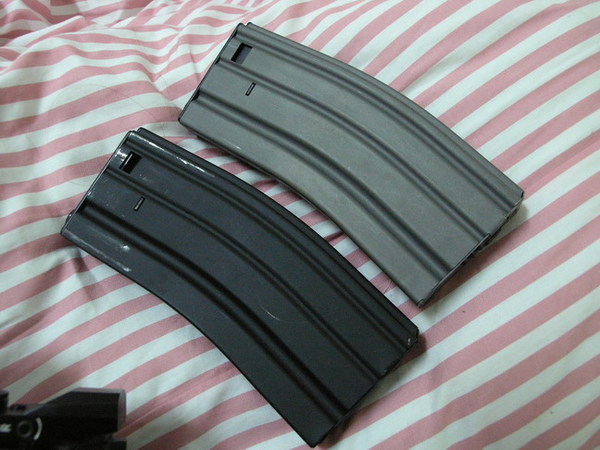 內部的附件不多, 就是只有說明書, 和電池裝置方式各一份, 通槍條一條, BB 彈一小包. 附的彈匣是 300 連的, 外殼採用號稱磷酸鹽處理, 不過實際上似乎更容易看出鏽蝕..摸沒多久彈匣就開始顯現出鐵銹的黃褐色了, 尤其匣身又是銀色, 更加明顯.