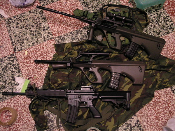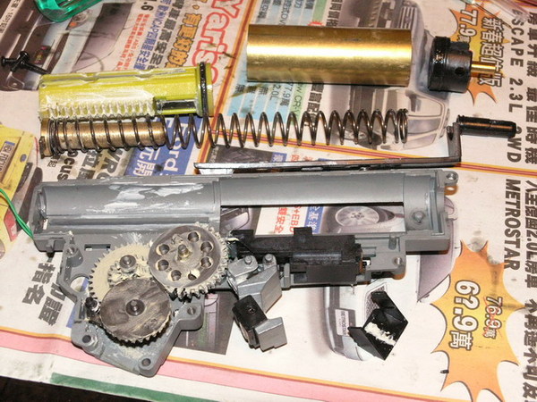 1.GB AUG 加上 650mm 內徑 6.02mm 精密管, FMC 100 彈簧, 滾珠活塞頭與滾珠彈簧導桿, 加大氣缸. 活塞頭順便加上泡棉作為緩衝. 一開始用了兩塊海綿黏起來, 不過前面那塊打了兩發就飛了. 只剩下底部較大的一塊. 吸震效果不錯(應該也同時有氣墊的產生). 不過測試之後發現可能是內部汽缸容量不足加上推彈嘴氣密差的不像話, 因此打出來跟本是散彈槍. 後來海棉全拿掉是有好一點..不過震動就大了許多. 再想辦法找氣密推彈頭好了. 讓我印象深刻的是此槍在整理時順便稍微擦掉一些 box 過多的油, 測試省電能力居然是三槍之冠. 一顆原廠附的 8.4V 電池, 沒想到用了許久之後仍然可以在這支上面扣連發 600 發以上..而此時這顆電池已經不足以推動其他兩支槍了. 為了減震也順便在彈匣座接觸 box 的地方貼了塊雙面膠海綿用以穩定兼吸震. 此槍的省電表現..讓我不禁想與 CA AUG 作簡單的交叉測試. 馬達傘齒沒有用螺絲固定, 似乎是硬打進去的.
