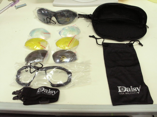^^^^ 外盒及全部配件. 鏡架 x1, 鍍膜鏡片三組: 暗灰帶藍色(在鏡架上), 暗褐色, 以及透明, 另外增光黃色無鍍膜一組. 彈性塑膠含海綿墊片鏡框兩個(一個在鏡架上). 可更換彈性帶一條. 攜行包(可上皮帶)及攜行袋各一. 攜行包內附有替換鏡片專用夾層三組. 配件相當豐富, 但我發現多附的那些鏡片我可能不會去用..因為有點麻煩.