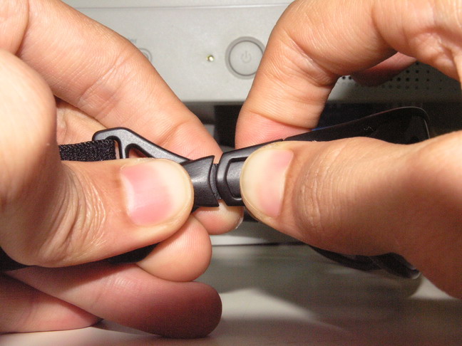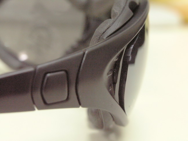 ^^^^ 鬆緊帶與鏡腳的更換方式. 將扣鈕按下後往後拉即可拉出. 扣鈕還算穩固, 需要施ㄧ點點力量才按得下去. 結合處是在鏡腳活動座上.