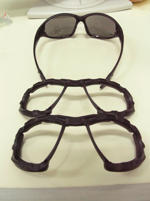 ^^^^ 橡膠彈性鏡框裝上鏡架後兩邊在上下各有三個透氣溝槽, 鏡片外側也有很大的空隙讓空氣流通. 腳座活動部分是在底下用一根螺絲鎖著, 請見相簿.