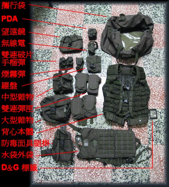 因此看來今年入手最有價值的東西就是整套的新加坡 Load Bearing Vest(LBV) molle 戰術背心組, 和不是很熟的 G-tech(應該是怪怪還是警星) molle 腿掛板含三連裝 5.56 彈匣袋及一顆小電. 新加坡的那套戰術背心算是我第一次接觸到模組化的掛載系統, 相關掛載袋應有盡有, 也有裝備攜行袋和水背袋, 不過沒有背包和傳統水壺袋. 一些縫紉的手工看起來都很扎實, 整體感覺很超值, 相對於國內類似裝備的售價以及新舊程度算是便宜了. 由於答應友人要寫一篇感想..唔, 要做的功課可多哩, 包括掛載方式. 晚點再把東西一一介紹讓沒看過的人參考一下. 該系統的製造商是新加坡的 D&G Soldiertalk, 連結在此.